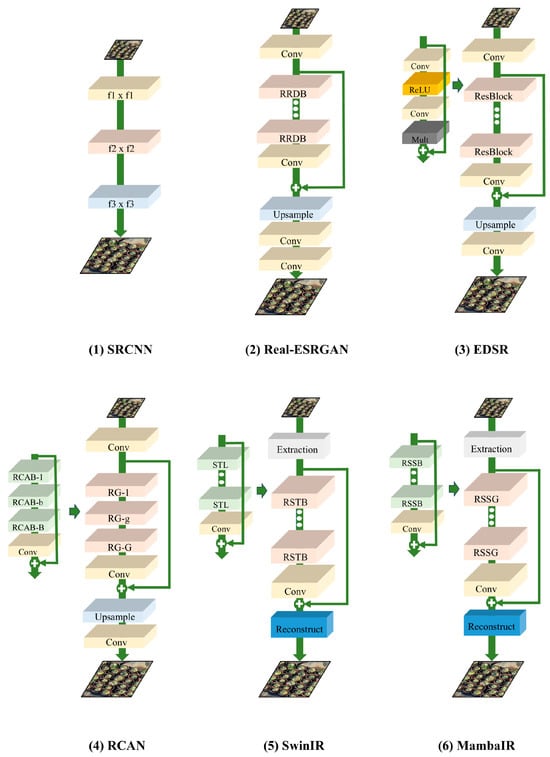 Super-resolution reconstruction (SRR) techniques, especially deep learning-based models, offer potential solutions to the UAV low-resolution problem []. SRR can enhance image resolution and restore or enhance detailed information in an image by transforming low-resolution (LR) images to high-resolution (HR) images. SRR algorithms can also improve model performance []. Traditional approaches contain interpolation, reconstruction-based methods, and more recently, learning-based techniques []. Among them, deep learning-based SRR algorithms have demonstrated superior performance by learning complex image patterns through deep learning models [,].