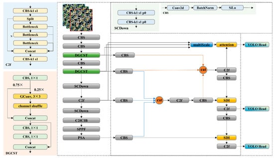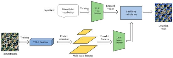 This study uses manually annotated label data and image features as input, employing YOLOv10 to extract features and obtain target region images. These images and labels are input into an optimisation module, where NMS operations are performed to select key target feature regions using CLIP image and text matching non-maximum suppression. The selected target features are then combined to form the final training data. The enhanced dataset using Mosaic is used to train the optimised model. During the training phase, as shown in Figure 6, images and data labels are input into the YOLOv10 backbone and CLIP text encoder, respectively. The backbone is then used as the main embedding, constrained by CLIP-based semantic information, along with the embedded category label text. CLIP text matching is used to achieve dual embedding, and the CLIP-based classification branch aligns with the zero-shot detection (ZSD) of the CLIP model for classification transfer learning. The YOLOv10 backbone network is enhanced with the proposed DGCST structure to improve its ability to detect unknown object features. The enhanced features are then input into the neck network for feature fusion. During the inference phase, images of size 600 × 600 are processed through the backbone and neck feature pyramid networks for feature extraction. The generated features are input into the detection head, where they undergo regression and classification branches to obtain the bounding box positions of detected objects and the semantic information of embedded image regions, respectively. The object categories are obtained through similarity matching with the text generated from the data labels.