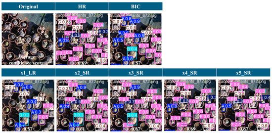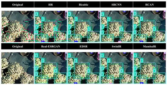 However, the detection performance of the Real-ESRGAN method is the lowest, with an mAP value of 72.4%. This may result from the generation of unnatural textures during the reconstruction, which compromised the image’s authenticity and detection accuracy. The mAP values of the other SRR methods are fairly similar and greatly exceed the Bicubic method, showing an average improvement of about 13.5%. As shown in Figure 8a,b, the improvements in SRR methods are accompanied by higher confidence scores, indicating a correlation between the enhancements in SRR methods and the improvement in image quality.