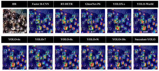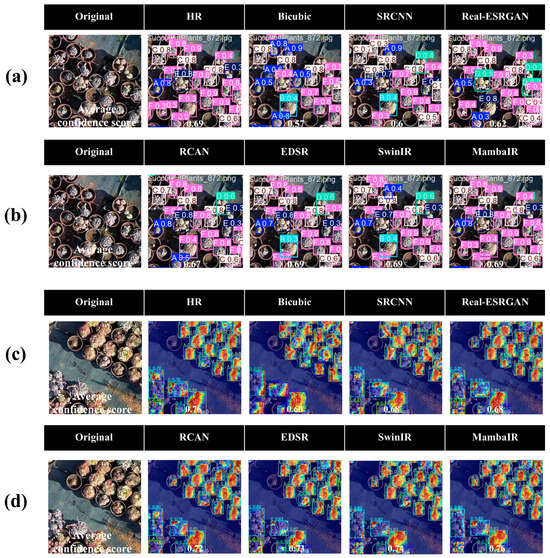 Figure 8c,d present the heatmaps superimposed on the object detection results. The Grad-CAM results reveal that the model’s focus extends beyond the bounding boxes, covering the entire image. The Succulent-YOLO model obtained the highest score of 0.84 for the HR test set, with heatmaps highlighting the intricate leaf textures of succulent plants. In contrast, the Bicubic method, with a confidence score of 0.46, displayed highlighted areas deviating from the actual location of the plants, indicating significant differences between reconstruction algorithms.