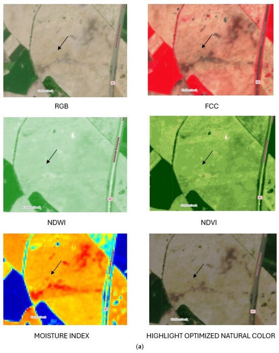 Image quality may also vary due to seasonal changes and day length, which affect sunlight incidence angles and the shading of subsurface features [10,20,21,22,23]. For instance, satellite imagery acquired during winter may more effectively reveal archeological features in temperate regions where vegetation cover is reduced [20,21,24]. The use of vegetation indices is not limited to NDVI and NDWI. Other indices, such as the Enhanced Vegetation Index (EVI) and the Red-Edge Position (REP), provide more detailed information on the vegetation condition [2,25,26]. Spectral analysis can reveal changes in plant photosynthesis caused by alterations in soil structure, potentially indicating hidden walls or foundations.