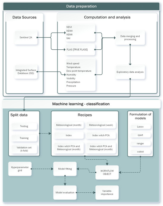 The proposed approach differs by enabling preselection of existing LANDSAT imagery, thereby facilitating the automatic exclusion of unsuitable images and assessing whether, based on historical meteorological conditions, it is appropriate to conduct aerial surveys during a given period. This simplified methodological framework yielded models with high precision and sensitivity, achieving an F1-score of 0.987 when combining indices with meteorological data. Even when using meteorological data alone, the models performed well, with an F1-score of 0.925.