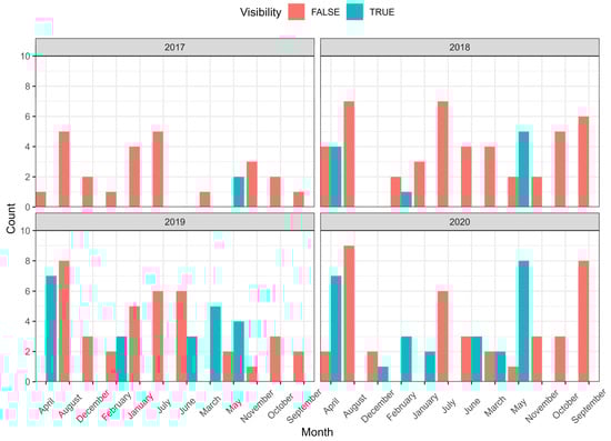 Monthly count of archeological site visibility events in satellite imagery by year and visibility status (TRUE = visible and FALSE = not visible). Empty months indicate either zero visibility or no available data.