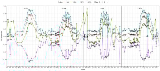 The results presented in Figure 5 indicate statistically significant differences in the mean values of the NAI, NDMI, NDVI, and NDWI indices depending on whether an archeological site was visible or not. This is evidenced by the non-overlapping 95% confidence intervals observed for each year. Mean NDVI values ranged from 0.18 to 0.20 when sites were visible (flag = TRUE), whereas for flag = FALSE, values ranged from 0.36 to 0.82. This suggests that archeological sites tend to be visible when surface vegetation is sparse. In contrast, sites are generally not visible when vegetation is moderate (NDVI > 0.2) or dense (NDVI > 0.6). Low NDVI values reflect vegetation stress, which enhances the detectability of subsurface features. The NDWI further supports the relationship between site visibility and soil moisture. Sites were visible at average NDWI values between −0.29 and −0.32, indicating moderately dry conditions. In contrast, extremely low NDWI values—typically associated with severe drought—corresponded to site invisibility, suggesting that very low soil moisture inhibits the detection of archeological features. A similar pattern was observed at NDMI values between −0.15 and −0.20, consistent with low vegetation and minimal water stress. The NAI, as proposed by [51], also exhibited characteristic values for visible sites (flag = TRUE), ranging from 0.06 to 0.08.