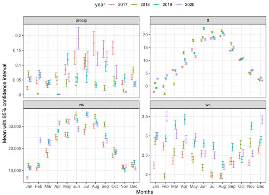 Monthly average values of selected meteorological parameters with 95% confidence intervals, stratified by year and archeological site visibility flags (overlapping confidence intervals (whiskers) indicate lack of statistical significance).