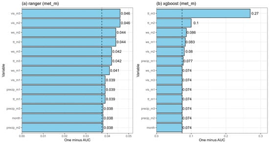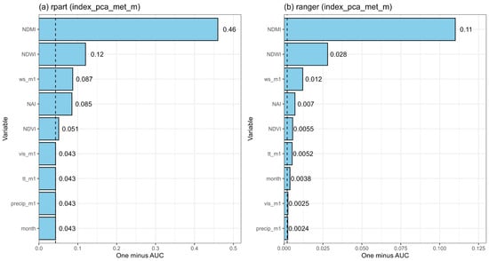 Variable importance assessed by permutation-based decrease in AUC (expressed as 1 − AUC) for selected models predicting the visibility of archeological structures based on indices and meteorological variables: (a) ranger and (b) xgboost. The dashed line indicates 1 − AUC for the entire model.