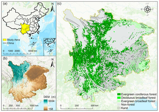 (a) Geographic location of study area; (b) elevation distribution; (c) karst regions and forest type distribution; the various colors indicate the different types of forests.