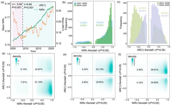 Long-term changes in forest dynamics and resilience in Southwest China from 2001 to 2008, 2009 to 2020, and 2001 to 2020. The solid lines in (a) represent the regionally mean NIRv (green) and AR(1) (red), with shaded areas denoting the respective 95% confidence intervals. Mean values of NIRv and AR(1) are plotted at the conclusion of each sliding window. The black dashed line marks the breakpoint in the time series. (b,c) Histograms of Kendall τ values for the NIRv and AR(1) time series, contrasting the periods 2001–2008 and 2009–2020. (d–f) Cumulative density distributions of Kendall τ relationships between NIRv and AR(1) shown for 2001–2008 (d), 2009–2020 (e), and 2001–2020 (f). Numeric labels within the four quadrants indicate the percentage of pixels in each quadrant. For visual clarity, raster data with non-significant Kendall τ values (p > 0.05) are excluded from the figure. N = 17,754.