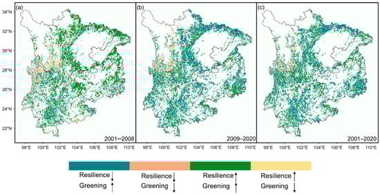 The spatial patterns of forest dynamics and resilience changes also exhibited regional differences. From 2001 to 2008, Sichuan and most areas of Guizhou showed a trend of simultaneous enhancement in forest greenness and resilience. However, in central Yunnan, despite the increase in forest greenness, resilience declined. A few areas in northern Yunnan experienced both forest browning and loss of resilience (Figure 3a). During the period from 2009 to 2020, although forest greenness continued to increase in most areas of the Sichuan Basin and Guizhou, resilience in these regions showed a declining trend (Figure 3b). Overall, over the two decades, except for a small portion of northern Yunnan and western Sichuan that experienced browning, more than half of the forests exhibited greening with a decline in resilience (59.91%). In contrast, only around one-third of forests showed signs of both greening and increased resilience (34.69%) (Figure 3c). This pattern highlights the complex relationship between greenness and resilience in the forest ecosystems of Southwest China.
