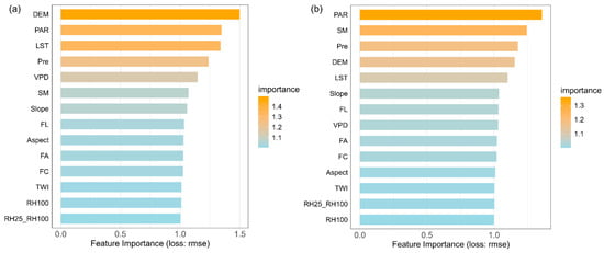 We used machine learning models to identify the key drivers of changes in forest resilience for coniferous and broadleaf forests in Southwest China and to evaluate their relative contributions. The coniferous forest dataset contained 11,523 samples, while the broadleaf forest dataset included 6231 samples. Both datasets were split into training and testing sets at a ratio of 75% to 25%. Hyperparameter tuning was performed using Bayesian optimization combined with five-fold cross-validation. Ultimately, the models achieved R2 values of 0.66 and 0.61 for predicting AR(1) on the test sets of coniferous and broadleaf forests, respectively (Figure A6). Based on permutation-based variable importance rankings (Figure 4), the key drivers significantly affecting AR(1) differed between the two forest types. For coniferous forests, the top five drivers were elevation, LST, PAR, Pre, and VPD, while for broadleaf forests, the top five were PAR, SM, Pre, elevation, and LST. Notably, climate factors dominated the main drivers of AR(1) in both forest types, highlighting the critical influence of climate on forest resilience in Southwest China.