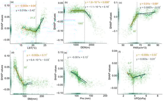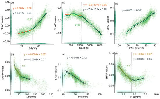 The impact of key drivers on resilience in broadleaf forests based on SHAP values: (a) LST, (b) DEM, (c) PAR, (d) SM, (e) Pre, and (f) VPD. Asterisks also indicate statistically significant regression slopes (p < 0.05).