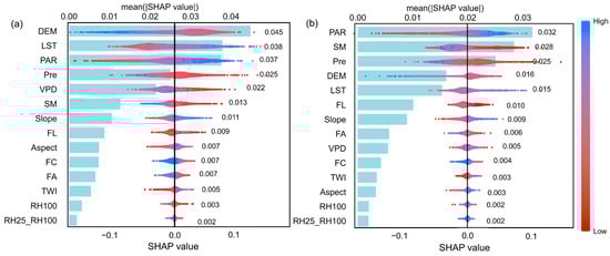 To evaluate the relationship between changes in forest resilience and various driving factors, this study used SHAP values to quantify the impact of each driver on model outputs (Figure 5, Figure 6 and Figure 7). The results showed that LST had different effects on the resilience of coniferous and broad-leaved forests. In coniferous forests, forest resilience gradually decreased with increasing LST, a trend reflected by the increasing SHAP values. When LST exceeded 16.8 °C, its negative impact on resilience became more pronounced, and the extent of resilience loss further intensified. In broad-leaved forests, resilience gradually increased with rising LST; however, when LST exceeded 21.3 °C, its effect on resilience turned negative. With increasing elevation, resilience improved progressively in both coniferous and broad-leaved forests. A similar trend was also observed for Pre. PAR exerted a significant negative effect on the resilience of both forest types, but in broad-leaved forests, the impact exhibited a phased pattern: when PAR exceeded 66 w/m2, its negative effect on resilience weakened. Increased SM helped enhance resilience in coniferous forests, while in broad-leaved forests, SM values below 93 mm were beneficial to resilience. However, once this threshold was exceeded, its effect turned negative. VPD had a similar influence on the resilience of both coniferous and broad-leaved forests, with a turning point at a certain threshold. Below this value, the effect was positive, while above it, the effect became negative.