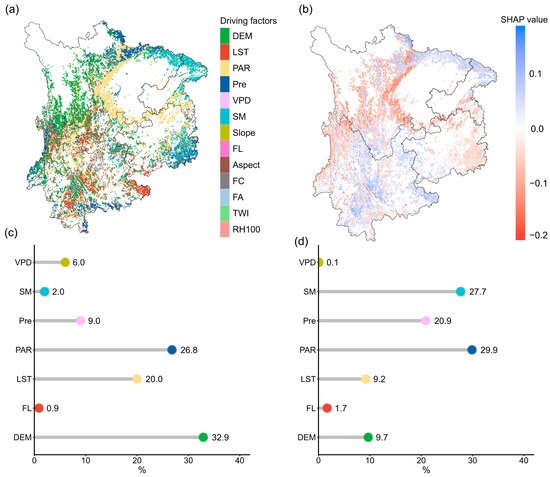 DEM had the most significant influence on coniferous forest areas, accounting for 32.9%, and was mainly distributed in western Sichuan (Figure 8a). This was followed by LST and PAR, with contribution rates of 26.8% and 20.0%, respectively, mainly affecting most areas of Yunnan Province and central Sichuan. The impacts of Pre and VPD accounted for 9.0% and 6.0%, respectively. The regions dominated by Pre were mainly located in northern Yunnan and northern Sichuan, while those dominated by VPD were primarily in central Yunnan and parts of northern Sichuan. In broadleaf forests, PAR was the most dominant driving factor, accounting for 29.9%, and was mainly distributed in eastern Guizhou and central Sichuan. This was followed by SM and Pre, with contribution rates of 27.7% and 20.9%, mainly concentrated in northeastern Sichuan and eastern Guizhou. DEM and LST had relatively smaller impacts in broadleaf forests, accounting for 9.7% and 9.2%, respectively.
