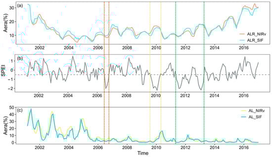 Time series of drought severity and ALR_NIRv, ALR_SIF, AL_NIRv, and AL_SIF areas. (a) Proportions of ALR_NIRv and ALR_SIF areas. (b) Long-term variation of SPEI-03, with the gray dashed line indicating SPEI = −0.5, and drought severity classified according to Table 1. The colored dashed lines represent drought events in the Southwest China forest from 2001 to 2020, specifically in 2006, 2009/2010, and 2011–2013. (c) Proportions of AL_NIRv and AL_SIF areas.