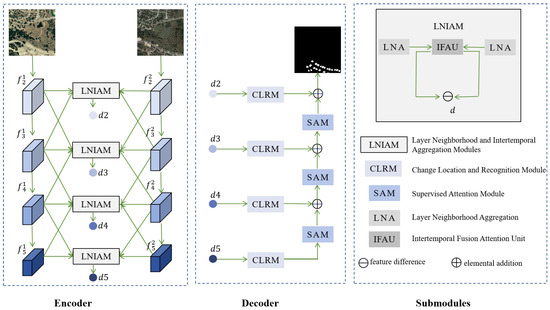 Architecture diagram of MIANet. The encoder, decoder, and submodules of the change detection model are included.