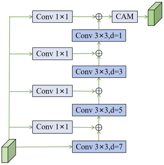 As shown in Figure 3, feature is assumed to be the input of the CLRM. First, the feature transformer is performed using four residual convolutions to obtain features , , , and (bottom to top), respectively. Then, feature is obtained by performing an addition operation with after applying a dilated convolution with a dilation rate of 7 to feature . Similarly, , , and perform similar operations to obtain features , , and according to Equation (2).