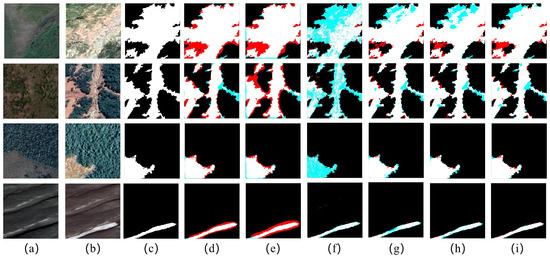 Firstly, a qualitative comparison of the algorithmic results on the LEVIR-CD and GVLM datasets was performed. Figure 8 and Figure 9 illustrate the detection results across different regions of the dataset. For clarity, we use labels (a–i) to represent the bi-temporal image, the ground truth, and the detection results for each algorithm. For better comparison, the visualization uses several colors to represent different prediction types: white for true positive, black for true negative, blue for false negative, and red for false positive.