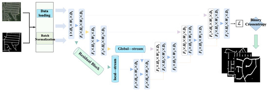 This work proposes a Dual-Stream Dynamic Fusion Network, whose architecture is shown in Figure 1. It consists of a Local Feature Stream and a Global Semantic Stream forming a dual encoder, achieving precise road topology extraction through multi-level feature fusion. Given an input image , the model outputs a road probability map , expressed mathematically as follows: