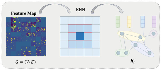 The feature map is transformed into a graph structure , where nodes correspond to feature vectors , and edges are constructed via a k-NN algorithm () (Figure 4). Multi-head graph attention (GAT) computes node updates:
