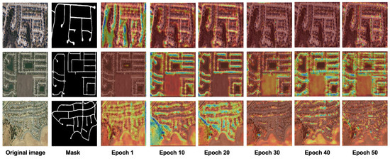 The experiments were implemented on an NVIDIA RTX 4090 GPU (NVIDIA, Santa Clara, CA, USA) platform, with the model constructed based on the TensorFlow 2.9.0 framework. Training parameters: batch size 8 (constrained by high-resolution VRAM), Adam optimizer (initial learning rate 3 × 10−4, 50 training epochs (early stopping threshold 10), data augmentation including random rotation (±30°) and brightness perturbation (±15%). Evaluation metrics included pixel-level IoU/Dice coefficient, topological connectivity error, and inference speed (FPS), with results averaged over five random seed experiments. Detailed parameter configurations are shown below (Table 1):