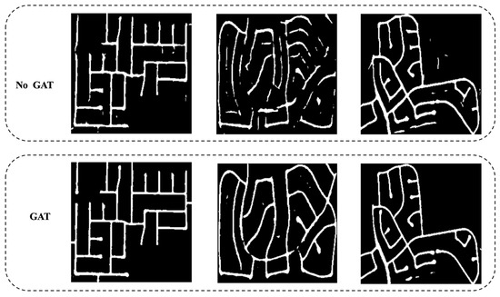 In Figure 8, we show a comparison of the road extraction results with and without the GAT. After removing the GAT, obvious dioxathulties appear on fragmented roads.