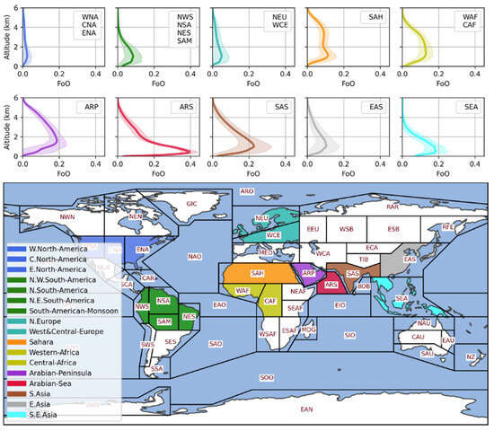 - Pan, H.; Huang, J.; Kumar, K.R.; An, L.; Zhang, J. The CALIPSO retrieved spatiotemporal and vertical distributions of AOD and extinction coefficient for different aerosol types during 2007–2019: A recent perspective over global and regional scales. Atmos. Environ. 2022, 274, 118986. [Google Scholar] [CrossRef]
