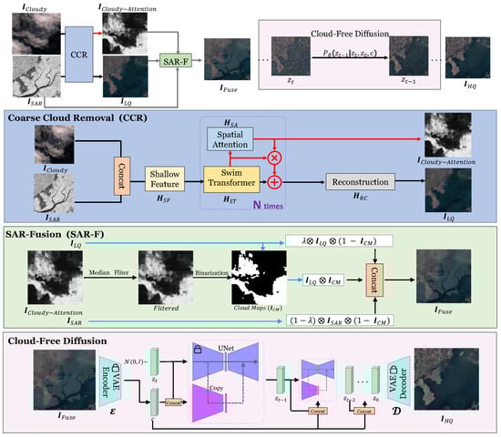 As shown in Figure 1, SAR-DeCR comprises three stages. In the first stage, coarse cloud removal, incorporates elements such as the Swin transformer and spatial attention components. The Swin transformer exhibits enhanced global modeling capabilities in comparison to the CNNs. The spatial attention module acts as a supplementary cloud removal component, guiding the model to detect cloud locations. In the second stage, SAR-Fusion, involves binarizing the output () from the first stage and concatenating it with and . is employed to introduce missing ground information in . In the third stage, cloud-free diffusion, the image is fed into the encoder for conversion into the latent space. Subsequently, the texture is reconstructed in the latent space and finally output by the decoder. Data in the latent space are more compact than in the pixel space. This compactness simplifies generation and denoising tasks, enabling the production of high-quality, cloud-free outputs.