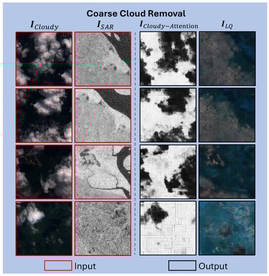 Inputs and outputs of our coarse cloud removal (CCR) module. The inputs consist of (first column) and (second column), while the outputs are (third column) and (fourth column). Each row represents a different visualization example. When compared to , successfully recovers most information obstructed by clouds, including ground texture and color.