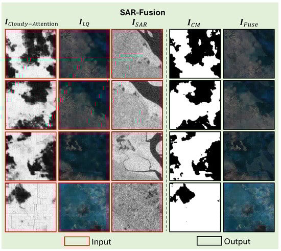 Inputs and outputs of our SAR-Fusion (SAR-F) module. Initially, (first column) is filtered and binarized, resulting in the generation of (fourth column). Subsequently, (second column) and (third column) are combined under the guidance of to restore the missing complex texture in , thereby generating (fifth column).