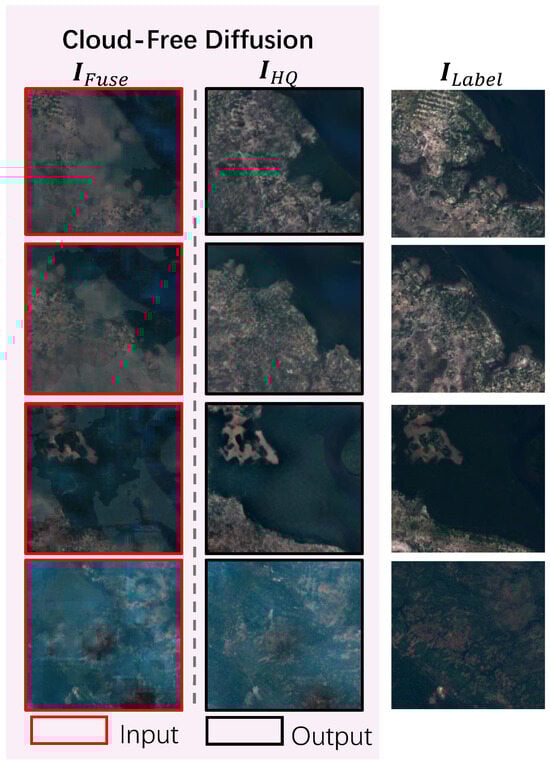 Inputs and outputs of our cloud-free diffusion (CF-D) module. The diffusion model generates the (second column) and closely resembles the label (third column), exhibiting a notable enhancement in detail compared to (first column).