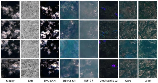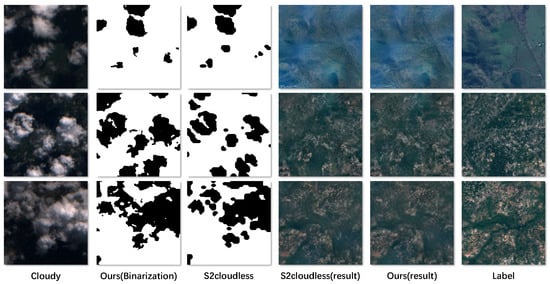 Cloudy is the original cloud map. The third column represents the binary image obtained by applying the s2cloudless method [51] to the cloud map. The following visualization demonstrates the discrepancy between the outcomes yielded by the cloud mask (s2cloudless) and our cloud attention approach. All experimental parameters remain constant, with the exception of the replacement of with the output of s2cloudless. As shown in the figure, the results obtained by the two methods are roughly similar. Comparing the second and third columns, we can see that the cloud attention method provides a more complete representation of some details. The fourth column shows the results generated by s2cloudless, and the fifth column shows the images generated by our method (SAR-DeCR). The last column shows the integrated cloud-free ground image.