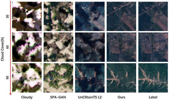 Synthetic Dataset. Figure 6 illustrates that our method can accurately restore ground truth textures and details in images with varying cloud coverages. In contrast, SPA-GAN tends to blur and distort under high cloud cover, and UnCRtainTS L2 struggles with detail processing. Our algorithm consistently produces generating results that closely resemble the original cloud-free images under various cloud coverage scenarios. Notably, under 90% cloud coverage, the images are essentially consistent with the cloud-free label images, showcasing exceptional capabilities in overcoming cloud occlusion.