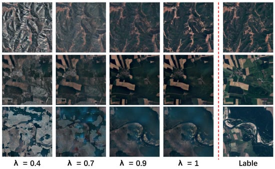 This figure illustrates the impact of varying the parameter on the visualization results of images when employing SAR data for cloud removal. The first three columns display results with different values (0.4, 0.7, and 0.9), demonstrating progressive improvements in detail and texture as increases. The fourth column shows the results without SAR data ( = 1), which lack the same level of detail. The final column displays the cloud-free ground truth image. When is set to 0.9, the generated image closely matches the ground truth in terms of texture and detail, underscoring the benefits of integrating SAR data with an optimal setting.