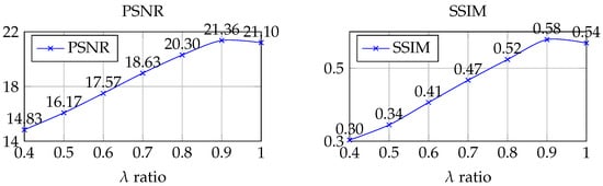 During the process of selecting in accordance with Equation (5), numerous tests were conducted. Considering that the FR method depends on reference images and is applicable to scenarios with available reference data, we ultimately selected PSNR and SSIM as the preferred evaluation metrics. The overall results indicate that the impact of is inversely proportional to the size of . As increases, the image quality indicators PSNR and SSIM also show improvement.