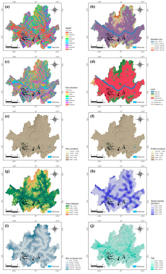 Thematic maps illustrating the flood-conditioning factors in the Seoul Metropolitan Area considered in this research: (a) aspect, (b) elevation, (c) flow direction, (d) land use and land cover (LULC), (e) plan curvature, (f) profile curvature, (g) slope, (h) stream density, (i) distance to stream, (j) topographic wetness index (TWI).