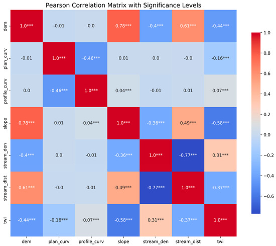 Pearson’s correlation matrix of continuous flood-conditioning factors. Asterisks indicate statistical significance (*** p < 0.001).