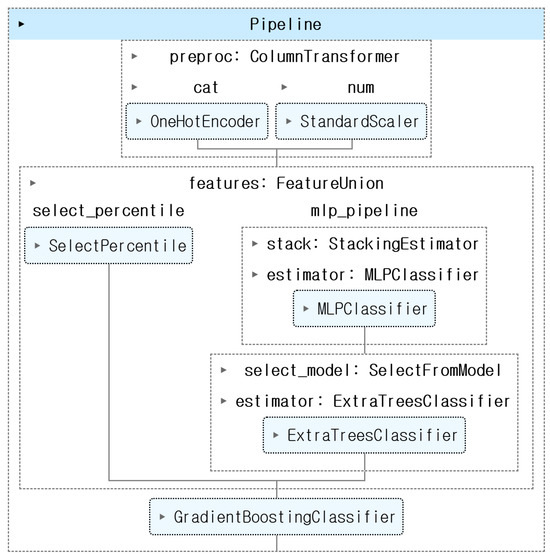 The TPOT framework was employed to automatically optimize ML pipelines for flood susceptibility mapping in Seoul. The final pipeline, selected based on the highest cross-validated ROC-AUC score, integrated three key stages: preprocessing, feature engineering, and classification.