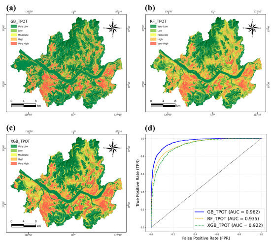 Flood susceptibility maps produced using each ML model: (a) GB_TPOT, (b) RF _TPOT, (c) XGB_TPOT, and (d) the Receiver Operating Characteristic (ROC) curve and the area under the ROC curve (AUC) for each ML model.