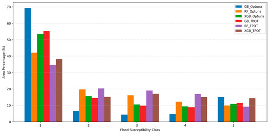 Comparison of area percentage by flood susceptibility class predicted by six models: Gradient Boosting (GB), Random Forest (RF), and XGBoost (XGB), each optimized using TPOT and Optuna.