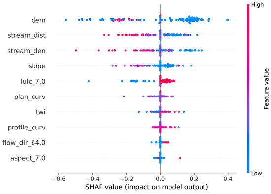 Notably, ‘dem’, ‘stream_dist’, ‘stream_den’, ‘slope’, and ‘lulc_7.0’ emerged as the most influential predictors. Lower elevation (‘dem’), shorter distance to streams (‘stream_dist’), and higher stream density (‘stream_den’) were associated with positive SHAP values, indicating increased flood susceptibility. The land use class ‘lulc_7.0’, corresponding to built-up areas, also contributed positively, reflecting the role of impervious surfaces in amplifying surface runoff. Furthermore, the color gradient in Figure 9 demonstrates how feature values affect model output: blue indicates low feature values, and red indicates high feature values. For instance, low ‘dem’ and ‘stream_dist’ values (blue) result in high SHAP contributions to flood risk, aligning with hydrological understanding of flood-prone lowlands.