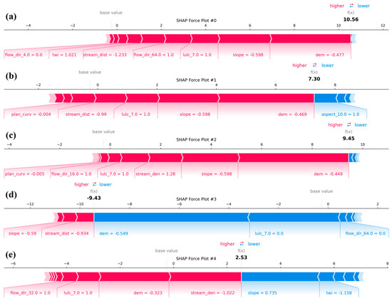 SHAP force plots illustrating the contribution of individual features to flood susceptibility prediction for selected instances. The x-axis shows SHAP values relative to the model’s base value (mean prediction), with red indicating features that increase the prediction and blue indicating those that decrease it. (a) High susceptibility (10.56), mainly influenced by stream distance and TWI. (b) High susceptibility (7.30), primarily driven by LULC and stream distance. (c) High susceptibility (9.45), attributed to stream density, flow direction, and LULC. (d) Very low susceptibility (−9.43), mainly decreased by elevation (DEM), LULC, and flow direction. (e) Low-to-moderate susceptibility (2.53), with increased risk associated with stream density, flow direction, and LULC.