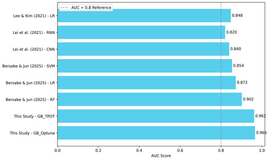 Over the past decade, various ML and statistical approaches have been applied to flood susceptibility mapping in Seoul. Lee and Kim [48] used a logistic regression model incorporating rainfall and topographic data, achieving an AUC of 0.848. While this study highlighted the utility of precipitation data, its reliance on static statistical modeling limited adaptability. Lei et al. [49] employed deep learning frameworks such as CNN (AUC = 0.840) and RNN (AUC = 0.820), offering improved feature representation but lacking interpretability and generalizability due to limited input diversity. More recently, Bersabe and Jun [50] introduced urban infrastructure variables such as sewer density and proximity to storm drains into a Random Forest model, achieving a notable AUC of 0.902. While these results underscore the value of engineered features in urban flood modeling, such variables were not included in the present study due to the lack of spatially detailed and validated infrastructure data across the study area. To ensure consistency and reproducibility, this study focused on publicly available topographic and hydrologic factors. Despite differences in variable selection, both studies consistently identify elevation and stream proximity as dominant predictors. In addition, our findings highlight the critical influence of stream density and built-up areas (LULC), particularly in low-lying and densely developed zones. These patterns reflect the urban flood dynamics of Seoul, where terrain and land use characteristics strongly govern flood susceptibility. This convergence on topographic and hydrologic factors reaffirms their fundamental role in urban flood modeling for the region. In comparison, the current study achieved superior performance using only topographic and land-use variables, without infrastructure-specific inputs. The Optuna-optimized Gradient Boosting model reached an AUC of 0.966, outperforming all previous models (Figure 12). This marks a 6.4% improvement over the highest prior result [50], achieved through advanced AutoML techniques including TPOT-based pipeline search and Bayesian tuning via Optuna.
