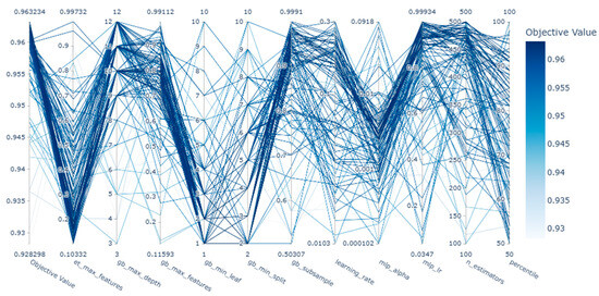 Parallel coordinates’ visualization of hyperparameter tuning trials: parallel coordinate plot.