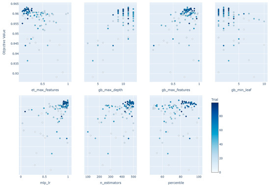 To further refine the predictive performance of flood susceptibility models, hyperparameter tuning was conducted using the Optuna framework based on the top three ensemble classifiers identified through TPOT: Gradient Boosting (GB), Random Forest (RF), and XGBoost (XGB). Rather than relying on TPOT’s internal optimization, Optuna was applied to these models independently to explore more fine-grained hyperparameter spaces within a fixed pipeline structure. This two-stage approach leverages the structural automation of TPOT for pipeline discovery and the precision of Optuna’s Bayesian optimization for targeted parameter tuning.