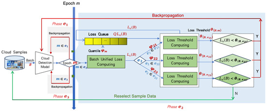 Phase employs three core components for sample difficulty assessment and selection: (1) sample loss computation using Unified Batch Loss (). is formulated as a weighted summation of classification loss, localization loss, and auxiliary loss; it is used to calculate the loss of the currently selected batch, serving as a direct indicator of sample difficulty, and higher values of correspond to more challenging samples; (2) a FIFO-based loss sliding window queue , which maintains the loss values of the most recent w batches; and (3) sample selection threshold calculation. is derived from the -quantile of , determining whether to retain samples for backpropagation. Phases , , and employ distinct thresholds to progressively include harder samples, progressively adjusting sample selection strategies according to the model’s evolving capabilities, and enabling a step-by-step learning process from easy to hard ground-based cloud samples.