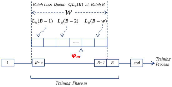 The dynamic loss threshold determines whether to retain the current sample’s training results for backpropagation. It is computed based on the loss sliding window queue values of the current batch B and the loss threshold quantile corresponding to the training phase m (as illustrated in Figure 3), as expressed in Equation (4):