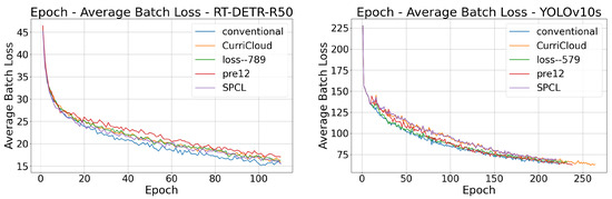 Figure 7 presents a comparative analysis of loss–epoch curves for the five training regimes on YOLOv10s and RT-DETR-R50 architectures.