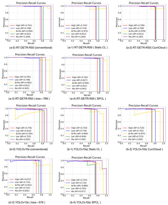 Due to the fact that CurriCloud skips some batches, the number of samples within each epoch is reduced. When the horizontal axis is epoch, the descent rate of the loss curve slows down. However, the loss when achieving the best effect does not change significantly compared with that of the conventional model. Figure 8 is the precision–recall (PR) curves comparing five training regimes—conventional (baseline), CurriCloud (proposed), and Static-CL—across three object detection architectures.