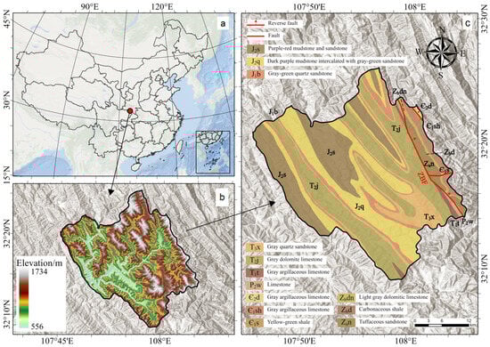 (a) Location of the study area. (b) Elevation of the study area. (c) Geological map of the study area. ZBF—Zhenba Fault Zone. J2s—Shaximiao Formation of the Middle Jurassic. J2q—Qianfoyan Formation of the Middle Jurassic. J1b—Shaximiao Formation of the Lower Jurassic. T3x—Xujiahe Formation of the Upper Triassic. T2j—Jialingjiang Formation of the Middle Triassic. T1t—Tongjiezi Formation of the Lower Triassic. P2w—Wujiaping Formation of the Upper Permian. Є2d—Douposi Formation of the Middle Cambrian. Є1sh—Shilongdong Formation of the Lower Cambrian. Є1s—Shipai Formation of the Lower Cambrian. Zbdn—Dengying Formation of the Upper Sinian. Zbd—Doushantuo Formation of the Upper Sinian. Zan—TNantuo Formation of the Lower Sinian.