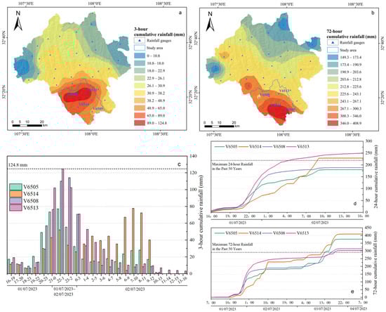 (a) The 3–h rainfall isoline map (Kriging interpolation). (b) The 72–h rainfall isoline map (Kriging interpolation). (c) Hourly 3–h cumulative rainfall and maximum 3–h cumulative rainfall at 4 rain gauging stations in the study area. (d) Comparison of 24–h cumulative rainfall and recorded rainfall at 4 rain gauging stations in the study area. (e) Comparison of 72–h cumulative rainfall and recorded rainfall at 4 rain gauging stations in the study area.